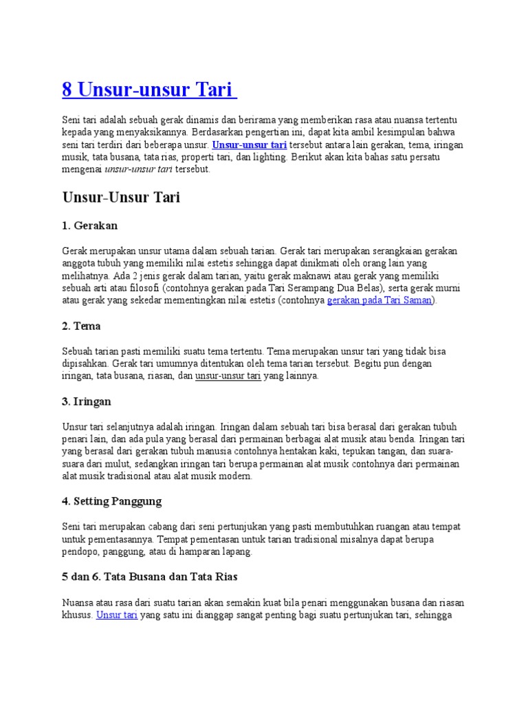 Dan dengan adanya unsur tersebut selain unsur utama, adapula unsur pendukung dari seni tari. Karena tarian merupakan ungkapan sebuah perasaan, maka seharusnya tarian yang diperlihatkan mampu menyampaikan ungkapan perasaan yang ada di. Apabila salah satu dari unsur ini hilang atau tidak diperhatikan, maka suatu pertunjukkan sendratari tidak akan harmonis. 27 pengertian seni tari unsur jenis contoh fungsi.